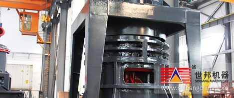 主(zhu)(zhu)機(ji)電動機(ji)通過減速器帶(dai)動主(zhu)(zhu)軸及各層轉盤(pan)旋轉,轉盤(pan)通過柱銷帶(dai)動幾十個環輥(gun)在(zai)磨(mo)環滾(gun)道內(nei)(nei)滾(gun)動并(bing)旋轉。大塊物(wu)(wu)料(liao)經錘式破碎(sui)機(ji)破碎(sui)成小(xiao)顆粒后由提升機(ji)送入(ru)儲料(liao)倉(cang),電磁(ci)振動給料(liao)機(ji)將物(wu)(wu)料(liao)均(jun)勻的(de)送到上轉盤(pan)的(de)中部(bu),物(wu)(wu)料(liao)在(zai)離心力的(de)作用下散(san)向(xiang)圓周(zhou)邊,并(bing)落(luo)入(ru)磨(mo)環的(de)滾(gun)道內(nei)(nei)被(bei)環輥(gun)沖壓、滾(gun)碾、研磨(mo)而粉(fen)(fen)碎(sui),物(wu)(wu)料(liao)經層粉(fen)(fen)碎(sui)后落(luo)入(ru)層及第(di)三(san)層,高壓離心風(feng)(feng)機(ji)的(de)抽吸作用將外部(bu)空(kong)氣吸入(ru)機(ji)內(nei)(nei),并(bing)經過第(di)三(san)層粉(fen)(fen)碎(sui)后的(de)粗粉(fen)(fen)帶(dai)入(ru)選(xuan)粉(fen)(fen)機(ji)內(nei)(nei)。選(xuan)粉(fen)(fen)機(ji)內(nei)(nei)旋轉的(de)渦輪(lun)使粗顆粒物(wu)(wu)料(liao)回(hui)落(luo)重磨(mo),細(xi)粉(fen)(fen)則(ze)隨氣流進入(ru)旋風(feng)(feng)集(ji)粉(fen)(fen)器并(bing)由其(qi)下部(bu)的(de)卸料(liao)閥排出即為(wei)成品,而帶(dai)有少量(liang)細(xi)粉(fen)(fen)塵的(de)氣流則(ze)經過脈沖除塵器凈(jing)化后通過風(feng)(feng)機(ji)和消(xiao)聲器排出。